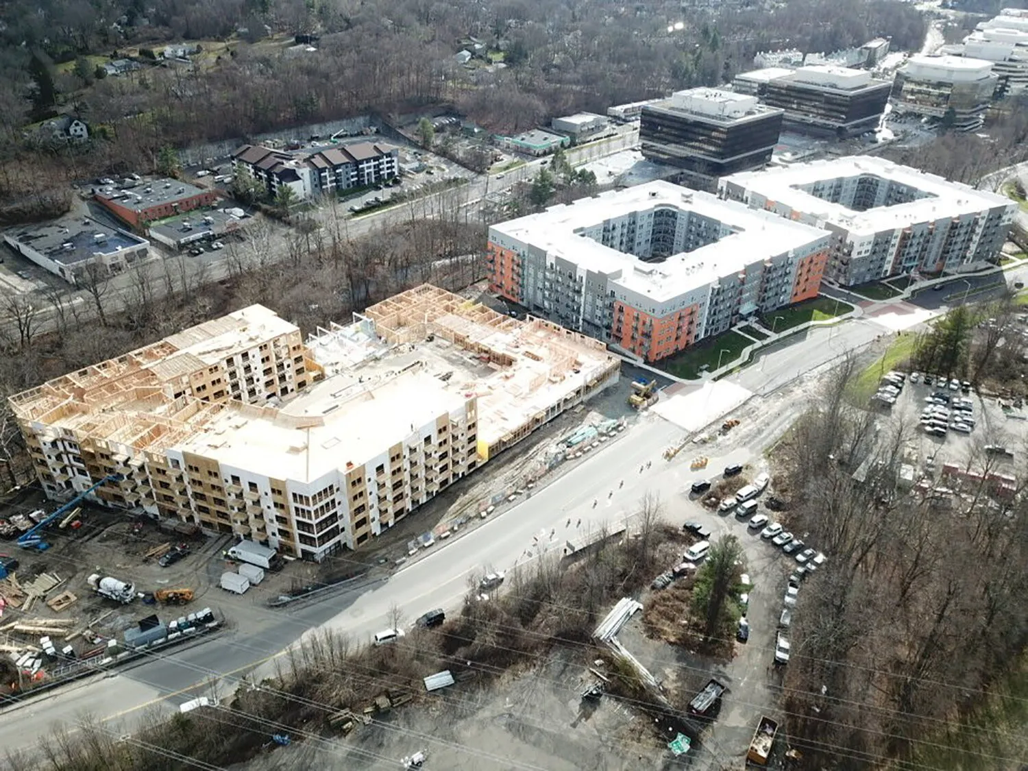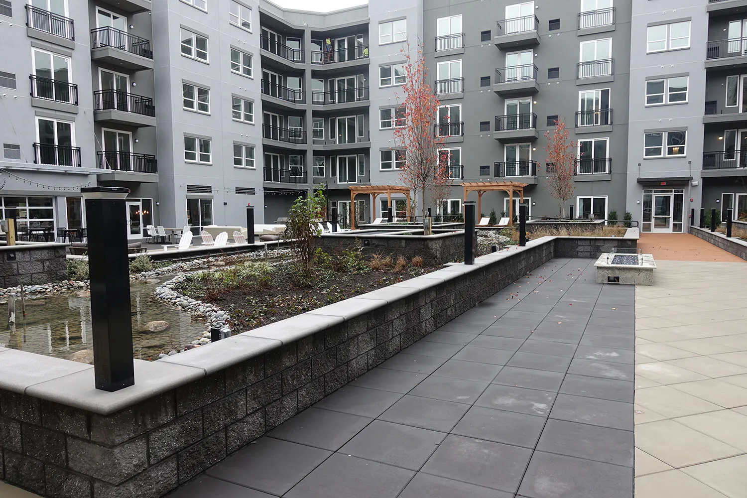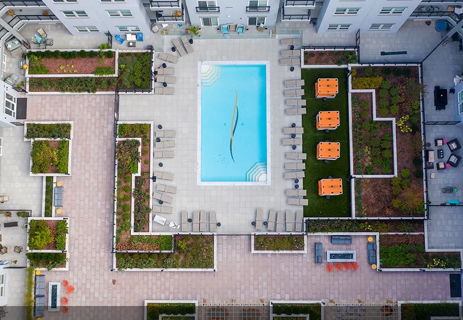 The Curb Building, 150/300 Glover Avenue located in Norwalk, CT is a high-density multifamily community (548 units) within a master planned transit village one mile to the Merritt 7 Train Station. The buildings feature podium style construction with five stories of residential apartments over two levels of structured parking with an extensive courtyard plaza area (60,000 SF) with pavers, planters and pool structures. The contractor BLT Management needed to keep on a tight schedule, so they wanted to waterproof the plaza decks without interruption of the construction schedule. On prior a phase of the development, BLT used an asphaltic membrane system for the plaza deck and upon learning of the advantages of the ENDURIT DECK Pro spray applied, fast cure waterproofing system–to improve the build schedule, BLT selected the ENDURIT DECK Pro-WM85 system.